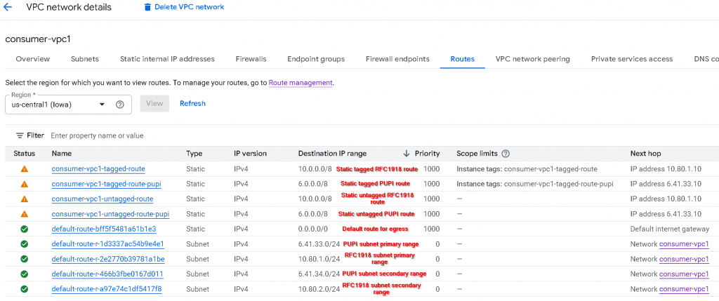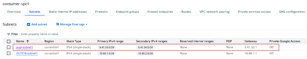 In producer-vpc, we can see only RFC1918 subnet routes shows up as Peering subnet. The PUPI subnets routes didn’t show up.