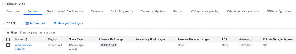 producer-vpc only have a single subnet with CIDR 10.240.1.0/24 assigned