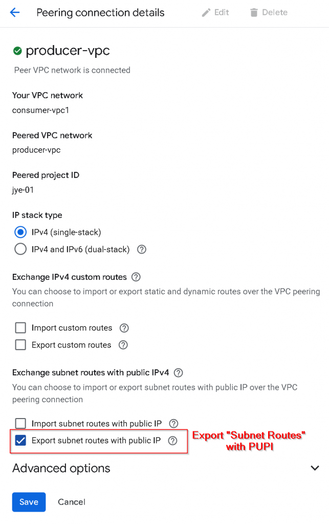 First, update VPC peering from consumer-vpc1 -> producer-vpc, check “Export subnet routes with public IP“, or I’m referring it to Export “Subnet routes” with PUPI