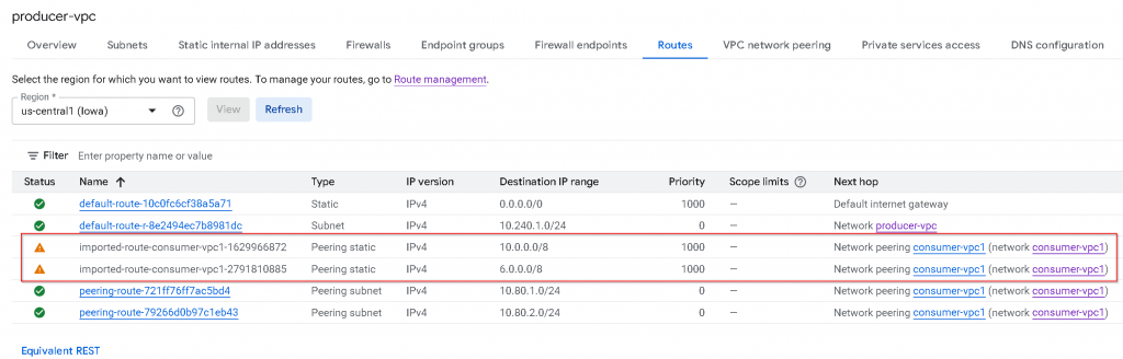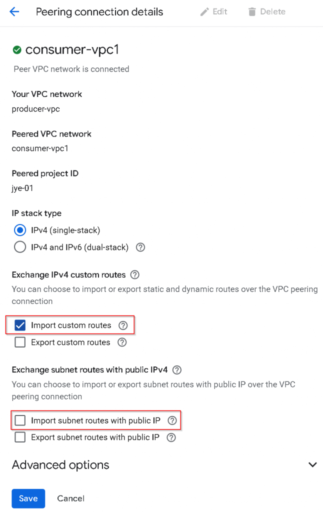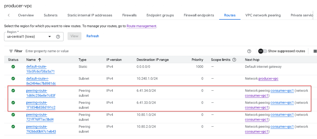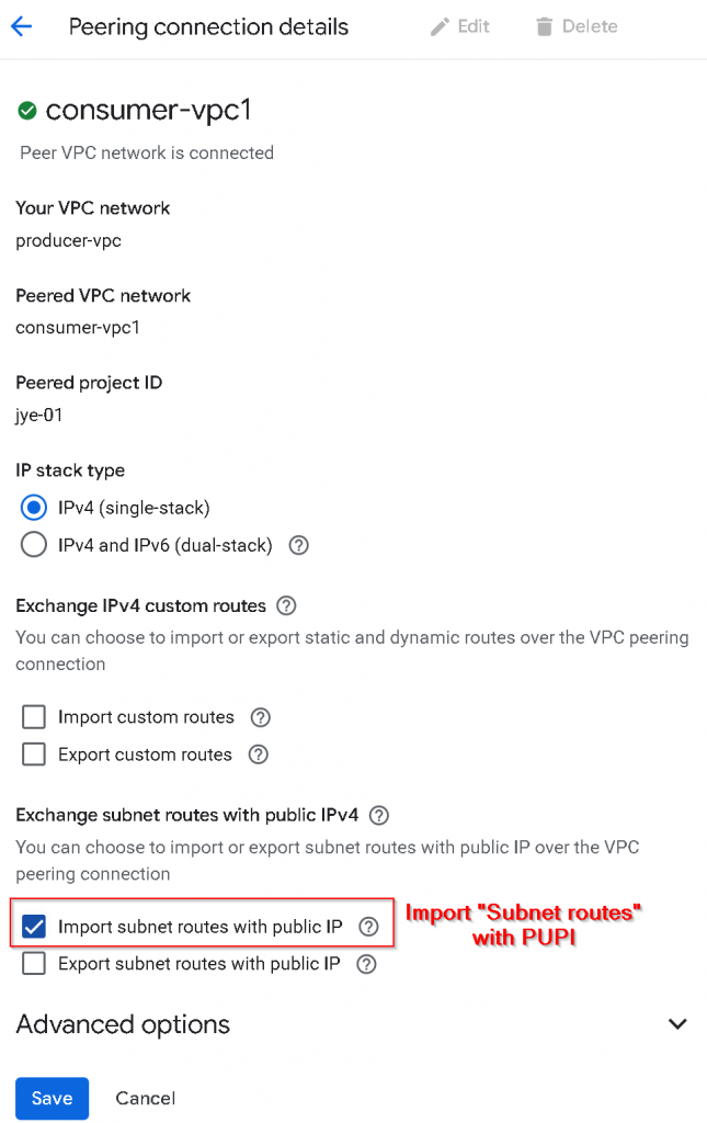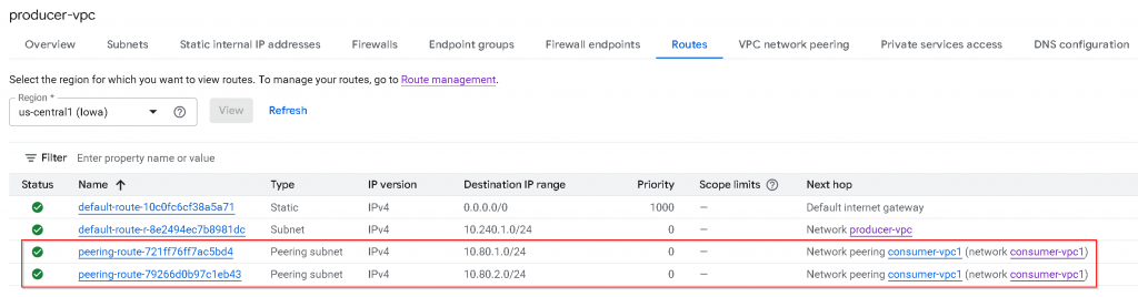 First, update VPC peering from consumer-vpc1 -> producer-vpc, uncheck “Export subnet routes with public IP“, or I’m referring it to Export “Subnet routes” with PUPI, check “Export custom routes