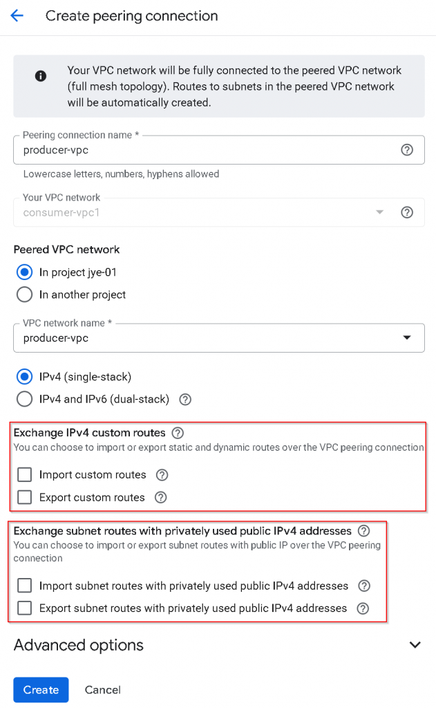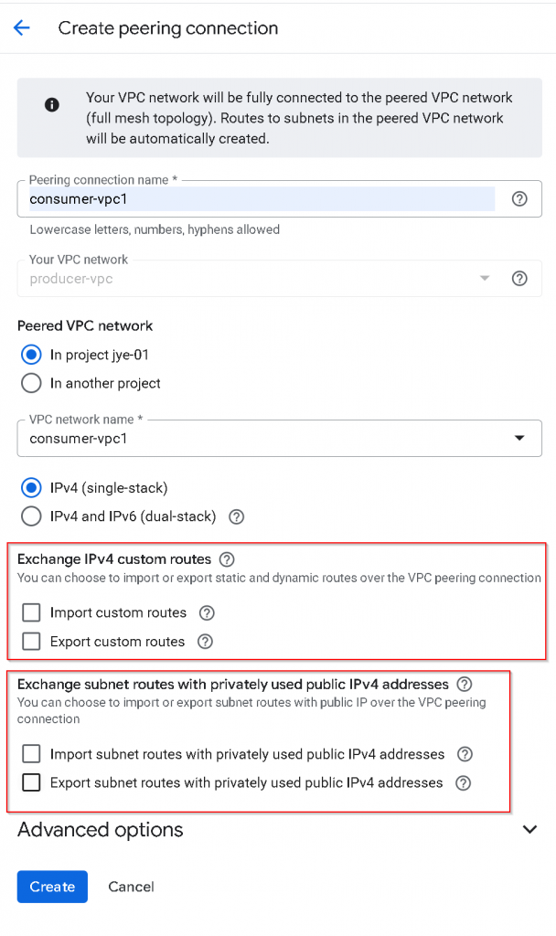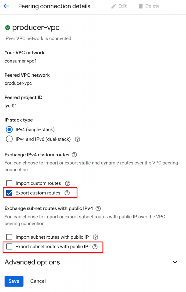 For the VPC peering from consumer-vpc1 -> producer-vpc, I’ve unchecked Exchange IPv4 custom routes, also unchecked Exchange subnet routes with privately used Public IPv4 address
