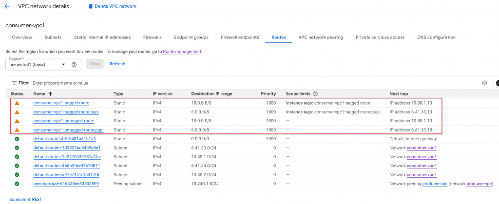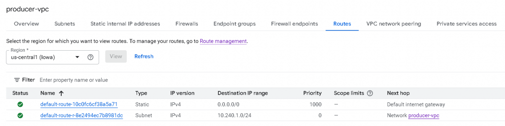 10.240.1.0/24 -> Network producer-vpc, type subnet, untagged (Scope limits column empty), priority 0. (Local routes for it’s own subnets)
