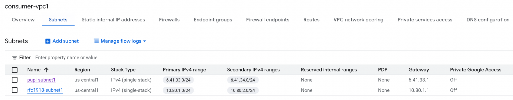 In consumer-vpc1, I have created two subnets, each subnet also assigned secondary IP range (for services that might use secondary IPs, such as GKE pods), also I’ve used IP address that either fall within RFC1918 (10.0.0.0/8, 172.16.0.0/12, 192.168.0.0/16), or Non-RFC1918 address range 6.0.0.0/8