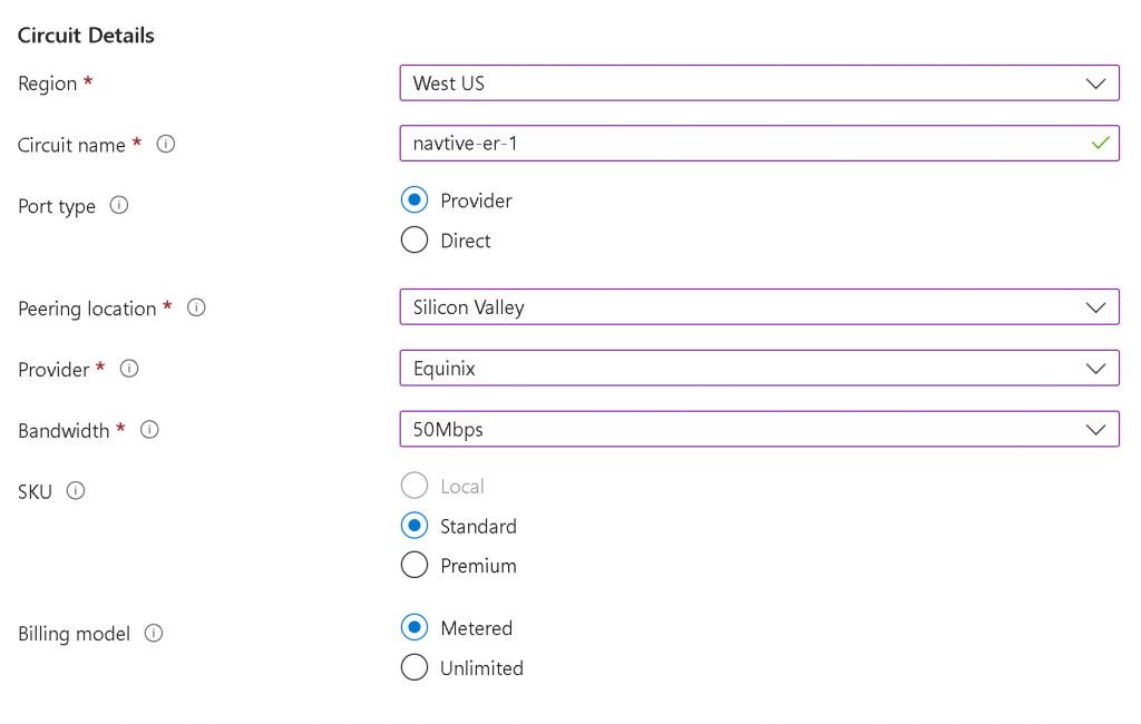Provide Region, Circuit Name, Port Type (Provider in this case), Peering Location, Provide (Equinix), Bandwidth, SKU and Billing model