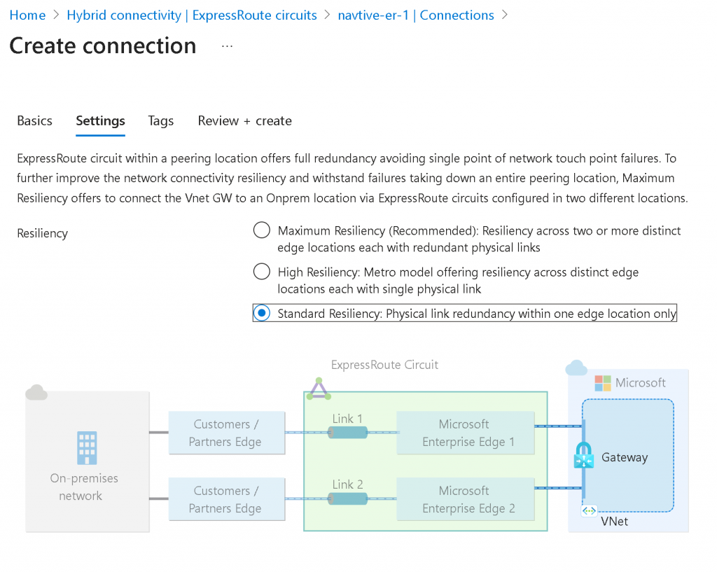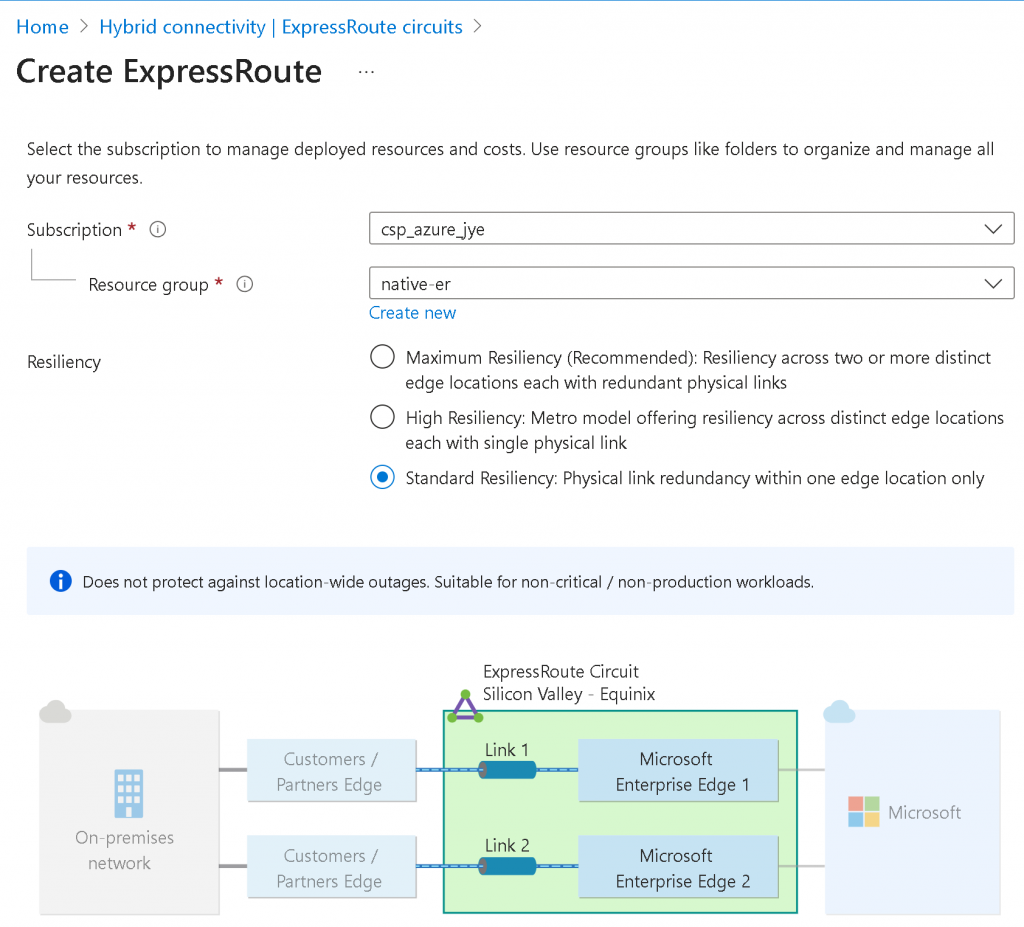 In Azure Portal, search for ExpressRoute circuits, click on create, select your Subscription and Resource Group, select Standard Resilience if the connection is only coming from a single Equinix location