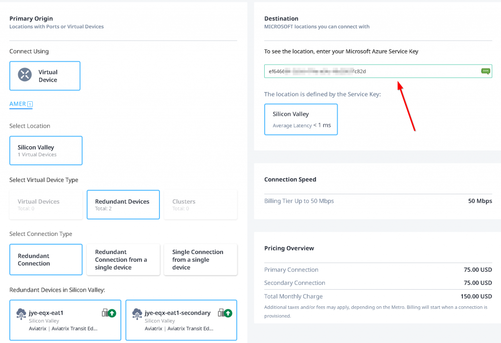 Select Virtual Device -> Location -> Virtual Devices (without HA), Redundant Device (with HA, EAT is always Active/Active), Cluster (doesn’t apply as it’s Active/Standby) -> Select EAT device -> Enter ER Circuit Service Key copied from last step -> Equinix will validate the key, if it’s valid you can click on Next
