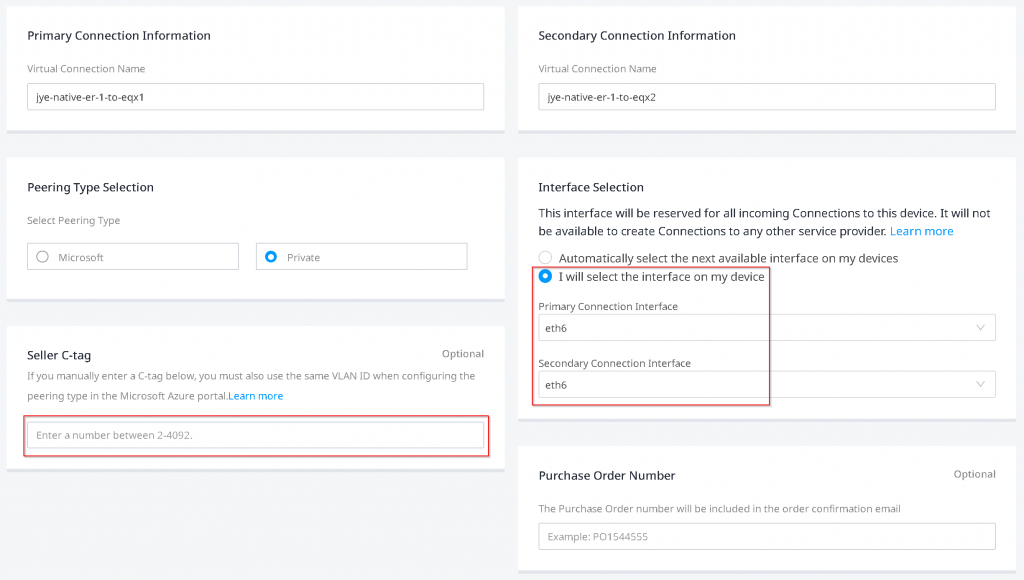 I have been struggling with Seller C-tag. There’s a high chance of entering a Seller C-Tag causing a conflicting VLAN ID during the connection creation, and when this happens, you will not be able to clean up the connection without engaging Equinix support. Equinix suggest to leave Seller C-Tag empty. Also it’s important to select the interfaces you assigned on EAT devices.