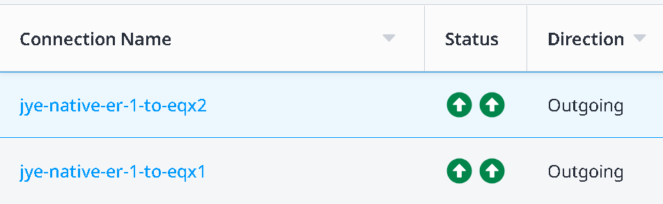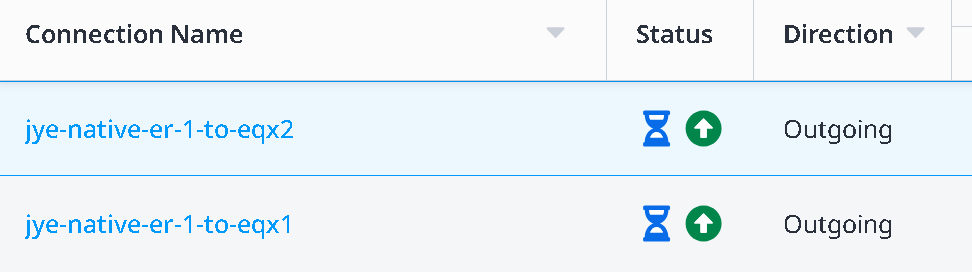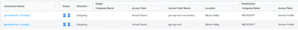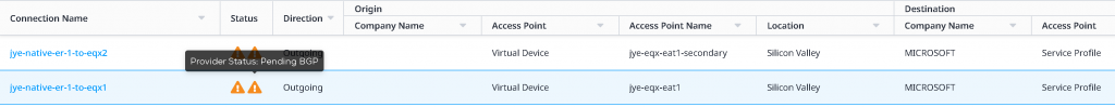 If you refresh on the Connections inventory page, you may see the status gradually change from Equinix (left side blue hour glass) pending – Provider (right side Green up arrow) provisioned