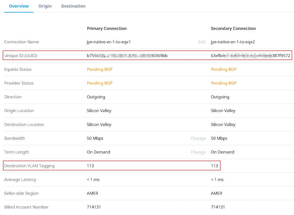 Click on the connection itself, note down the Destination VLAN Tagging ID, for following example: 113. Also note that the Unique ID (UUID) is needed when you open a support ticket with Equinix, if you run into issues.