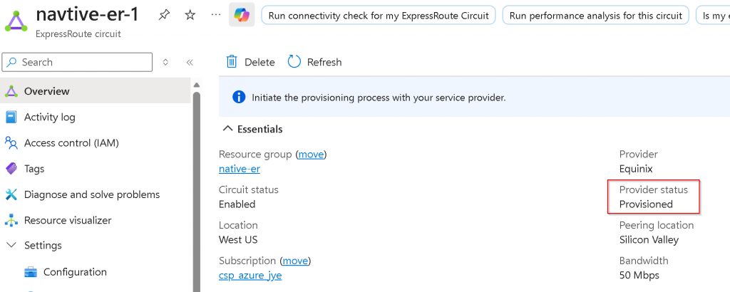 Switch back to Azure Portal, note that the ER circuit Provider status is now Provisioned