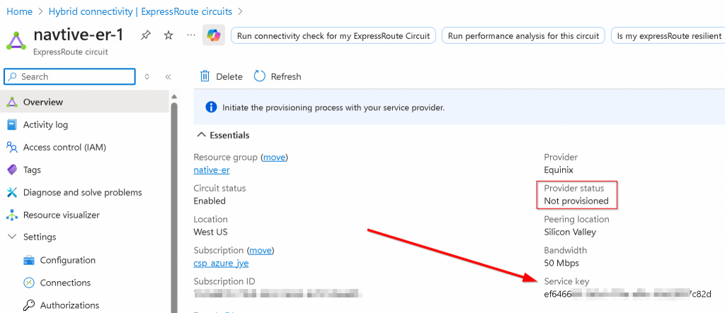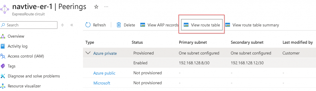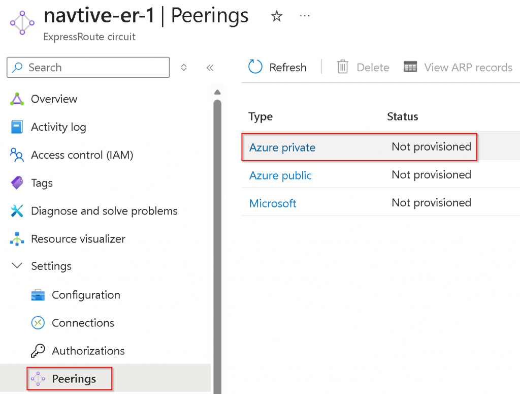 Peerings -> Click on Azure private (notice it’s Not provisioned)