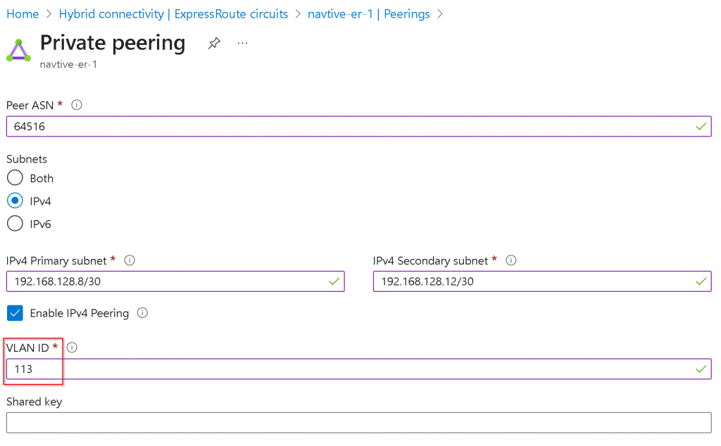 4. Configure Azure Private Peering with unique VLAN ID.