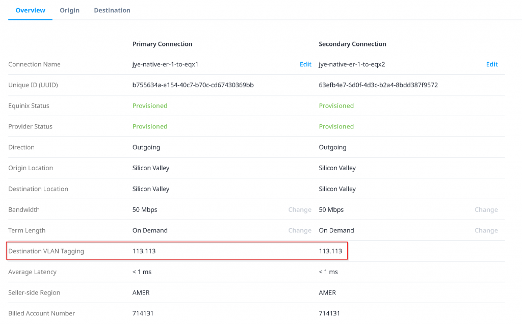 Now you click on the connection itself. You may notice the Destination VLAN Tagging change from 113 to 113.113 (where the right side portion is the VLAN ID set on Azure Private Peering). If this never changes, you will need to open support ticket with Equinix to see if the same VLAN ID became stale stuck on the port that need to be clean up.