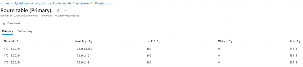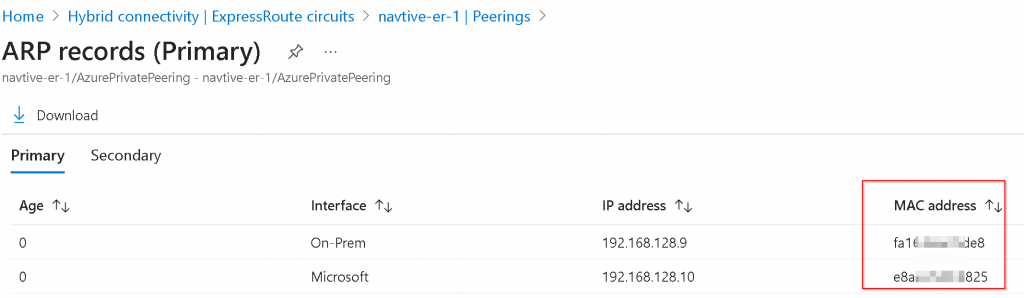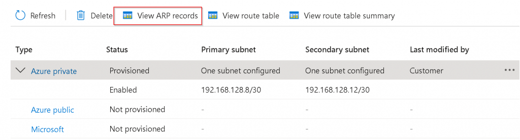 Switch back to Azure Portal -> ER Circuit -> Peerings -> Select Azure private -> View ARP records