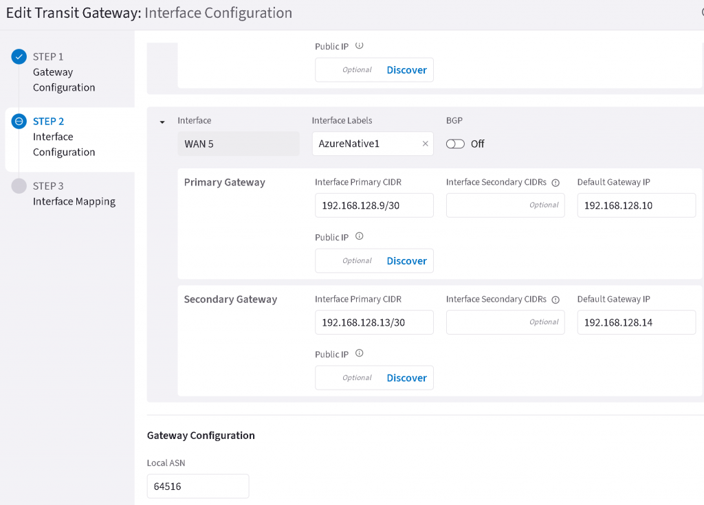 For this example, we will use WAN5/eth6 for Azure ER connection, note BGP (underlay) is set to Off. The primary CIDR/default Gateway need to be in the same /30 range, and Azure MSEE will always use the 2nd IP. Also note the MSEE always have 12076 as AS number.