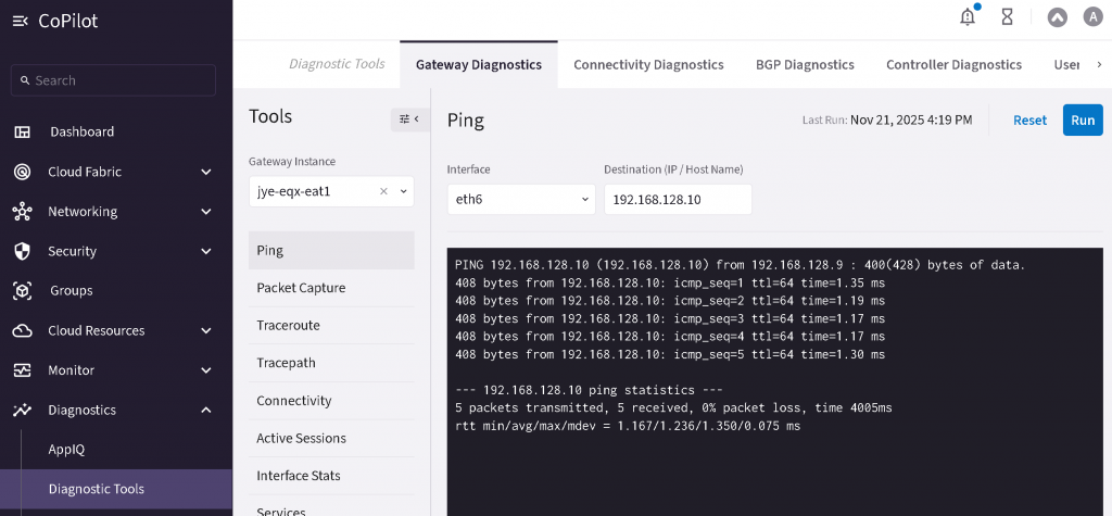 CoPilot -> Diagnostics -> Diagnostic tools -> Select EAT instance -> Select interface -> ping MSEE IP