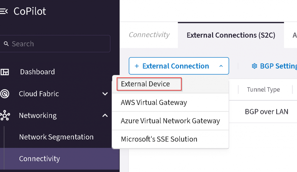 CoPilot -> Networking -> Connectivity -> External Connections (S2C) -> + External Connection -> External Device
