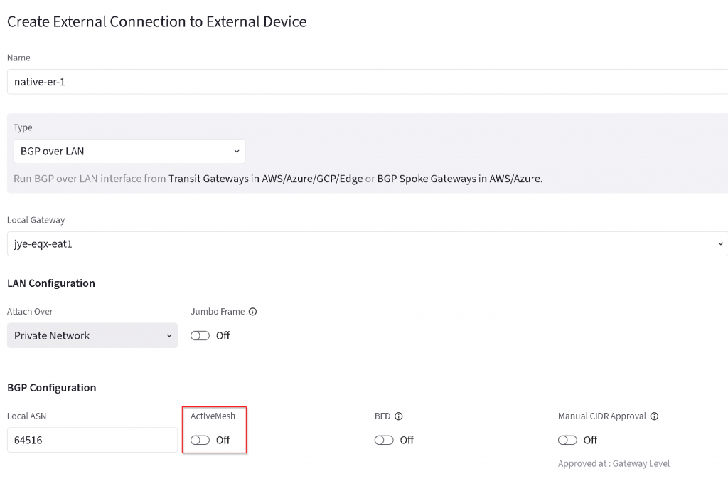 Name the connection, select BGP over LAN, select primary EAT, uncheck ActiveMesh,