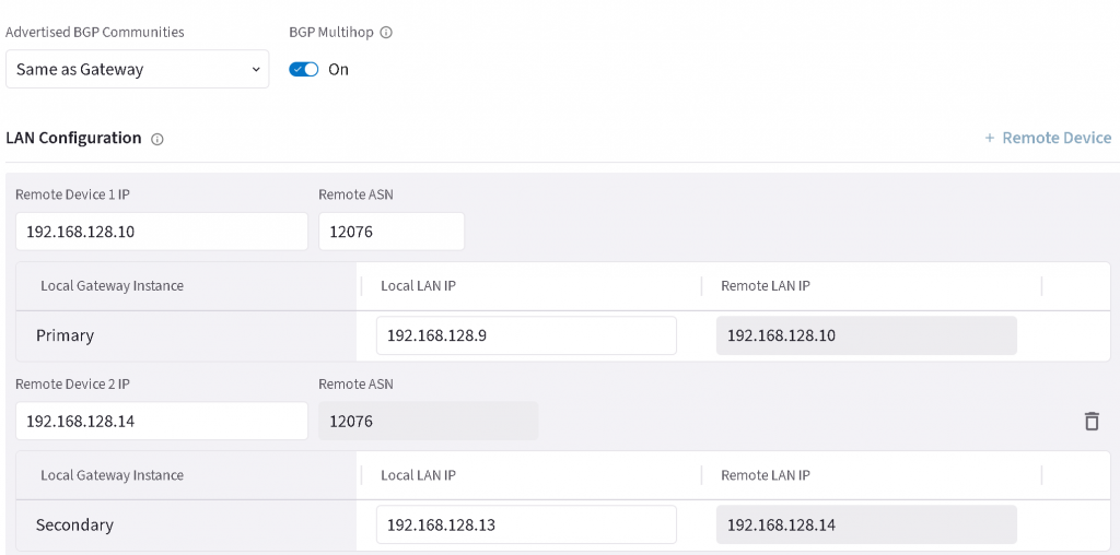 Add additional Remote device, enter Remote device IP and Local LAN IP for both primary and HA EAT, enter 12076 as MSEE ASN, then save the configuration.