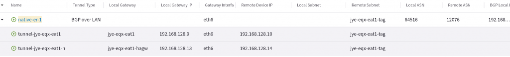 If you are terminating two ER circuits on the same EAT device. Both ER MSEE will have AS 12076, so the prefix learned from one ER circuit will be dropped by the other ER circuit due to the same ASN number. You will have to use EAT Manual BGP Advertisement towards both ER BGP over LAN connections to replace 12076 with EAT’s ASN.