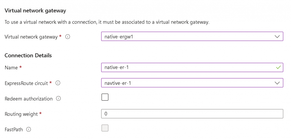 3. Use the ER Circuit service key to create Express Route connection towards the EAT interfaces