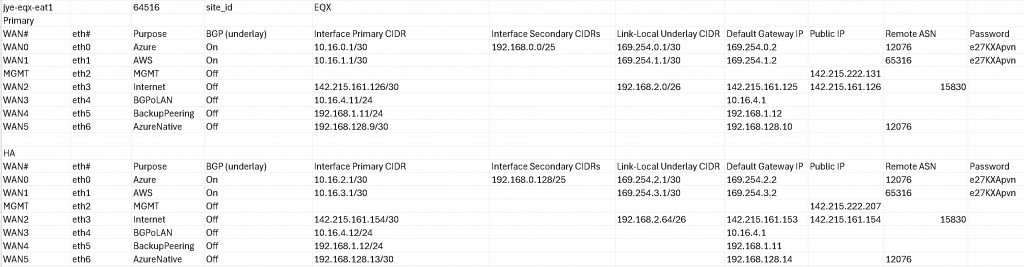Caution: If you will use Equinix Internet Access, then you cannot choose your own ASN for EAT, as Equinix Internet Access will assign a private ASN to you for the Internet Access BGP connection, as in my lab worksheet, the 64516 was assigned by Equinix as WAN2/eth3 is connected to Equinix Internet Access (I will create a blog just for this topic)