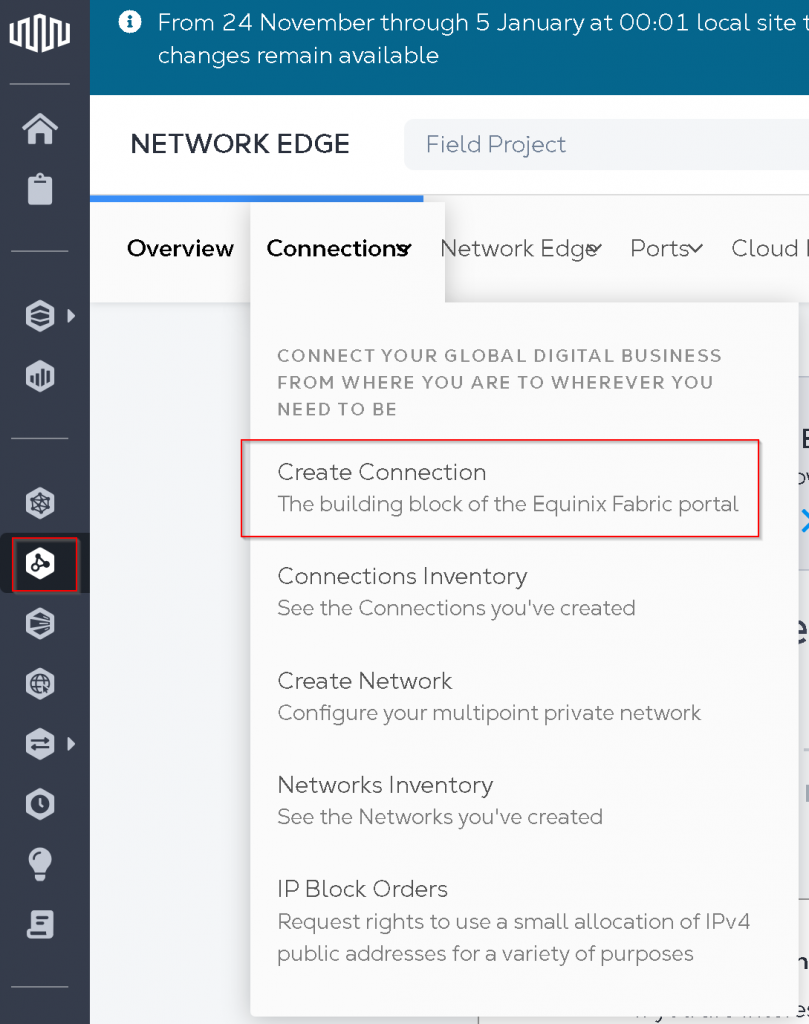 In Equinix Portal, select Connections -> Create Connection