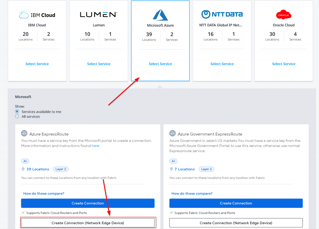 Find Microsoft Azure -> Select Service -> Create Connection (Network Edge Device)